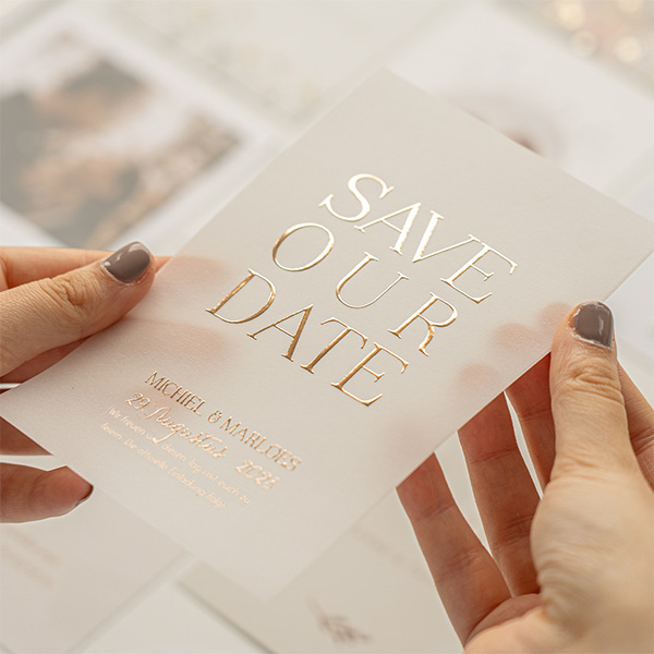 Stilvolle Save the Date Karte in Weiß aus Limettenpapier und mit Roséfolie