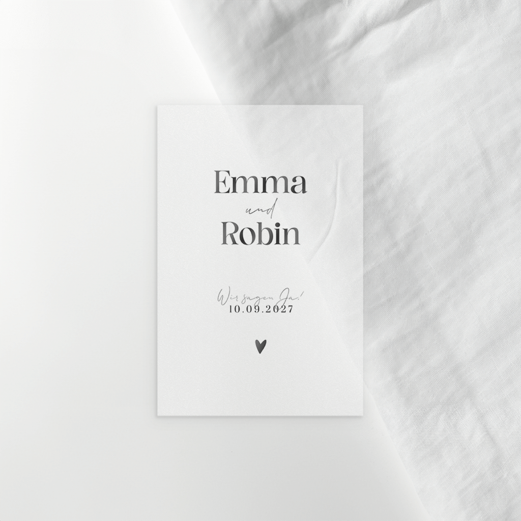 Minimalistischer Umschlag aus Transparentpapier mit holografischen Namen Transparentpapier, Weiß-transparentes Papier, 150 g/m². Bei diesem Blatt handelt es sich um ein Deckblatt, das sich für die Ergänzung einer Hochzeitskarte eignet. Dieses Blatt wurde speziell für diese Karte entworfen. Natürlich kann dieses Design auch als Deckblatt bei andere Karten verwendet werden.Melde dich für unseren Newsletter an und profitiere von exklusiven Angeboten, kreativen Ideen und Neuigkeiten aus unserer Produktwelt. Als Dankeschön für deine Anmeldung schenken wir dir einen kostenlosen Probedruck deiner Karte.