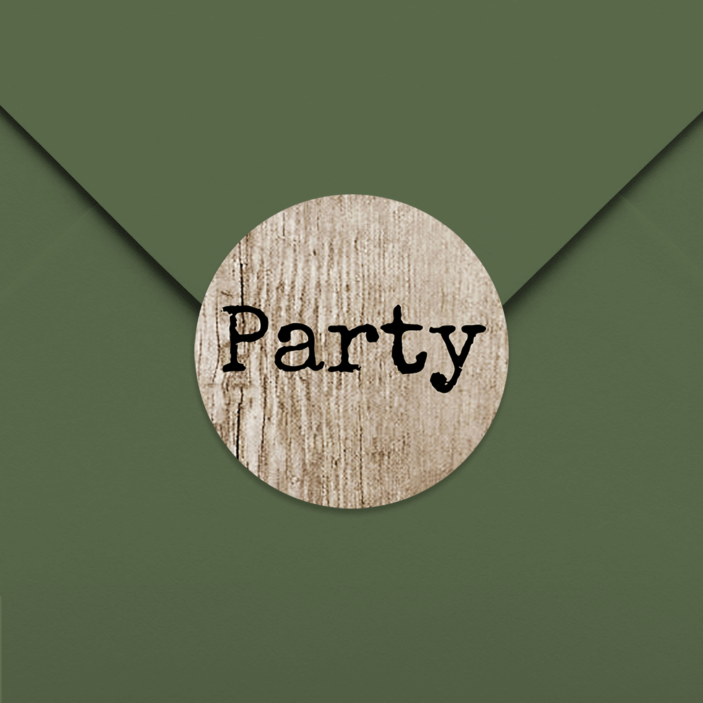 Aufkleber Party mit Holzhintergrund