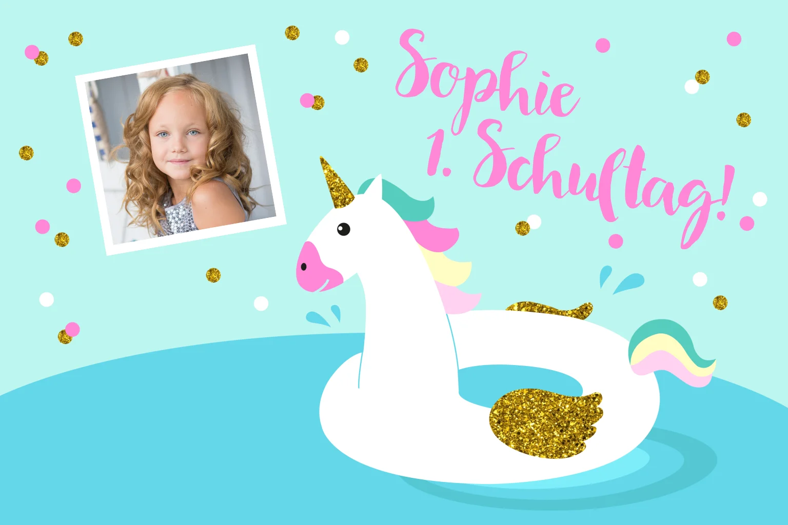 Angesagte Einschulungskarte mit Einhorn und Foto