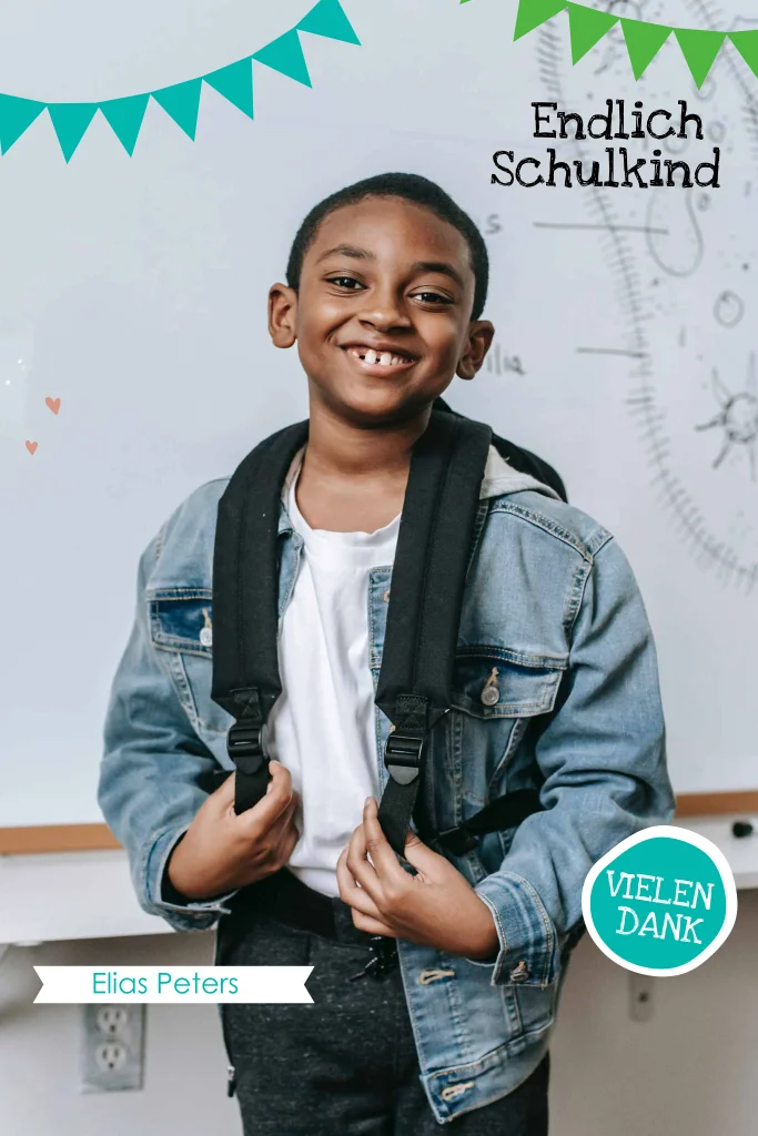 Tolle Danksagung zur Einschulung mit großem Foto und Girlanden auf der Vorderseite.