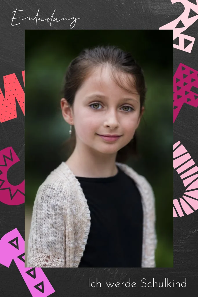 Einladung zur Einschulung im Tafel-Look, Foto und rosa Buchstaben