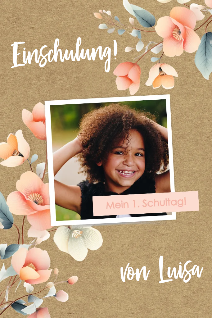 Einladung zur Einschulung mit Foto und Blumen im Kraft-Look.
