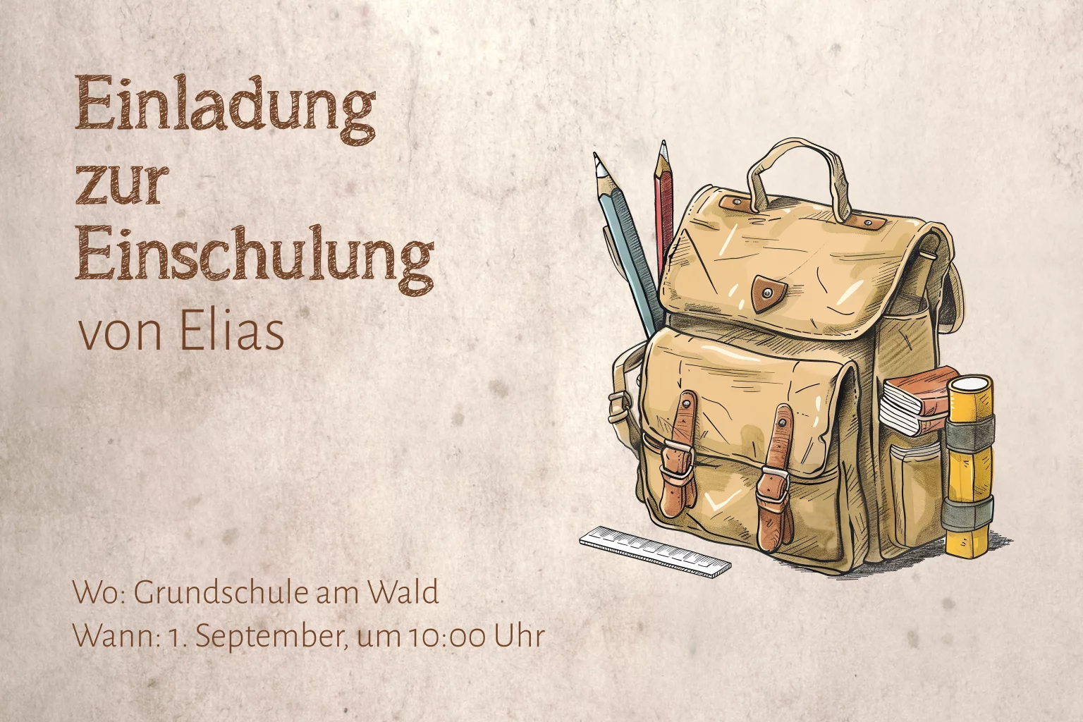 Einladung zur Einschulung mit Retro-Rucksack, Lineal und Bleistiften