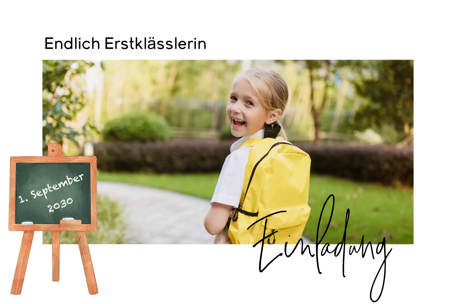 Einladung zur Einschulung mit Schultafel, Schule und großem Foto.