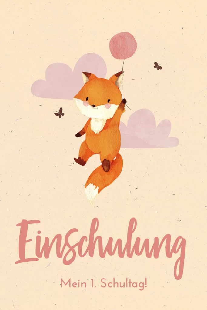 Einschulungskarte für ein Mädchen mit Fuchs und rosa Luftballon
