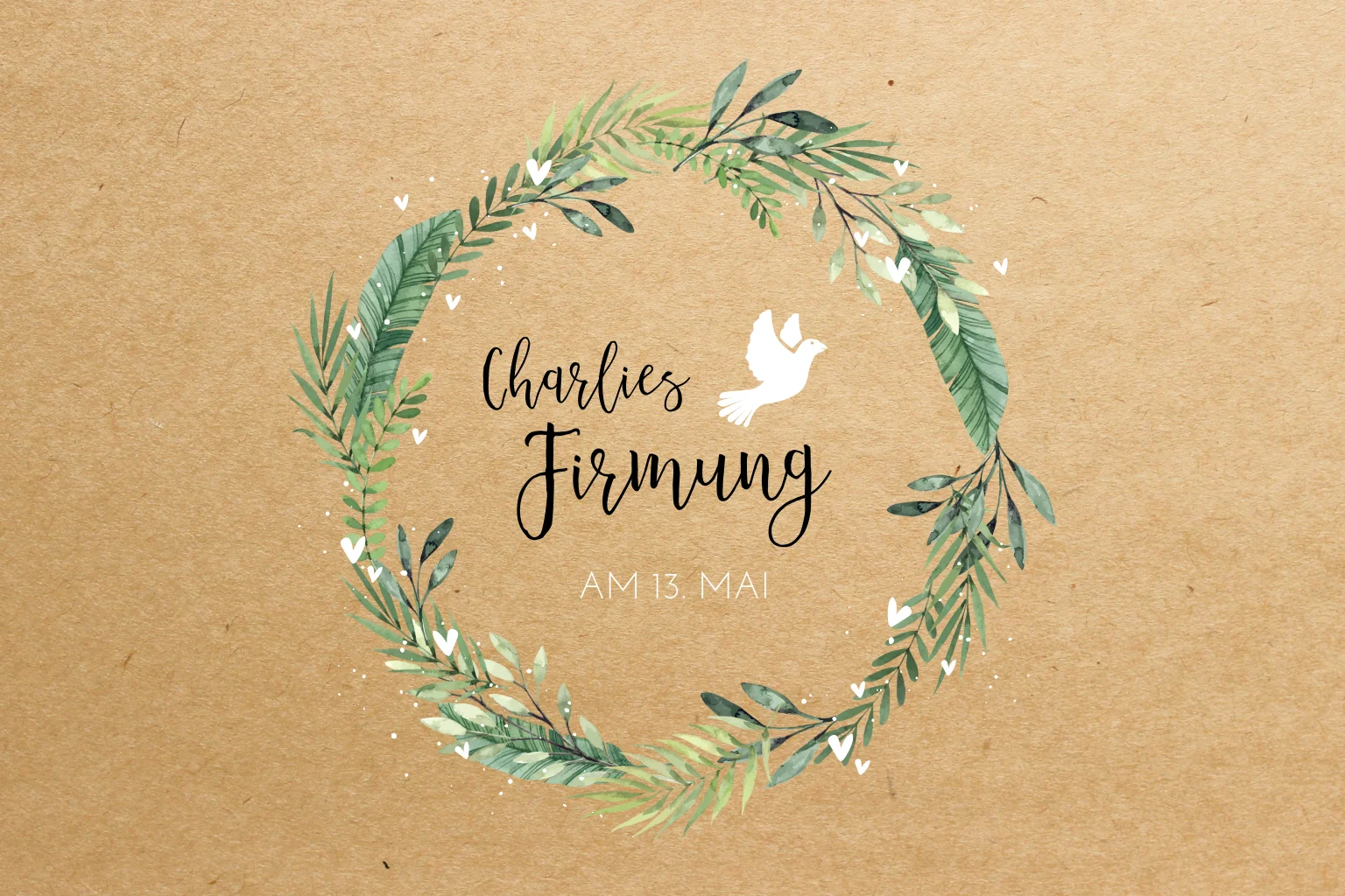 Einladung Firmung mit Blätterkranz, weißer Taube und Herzen