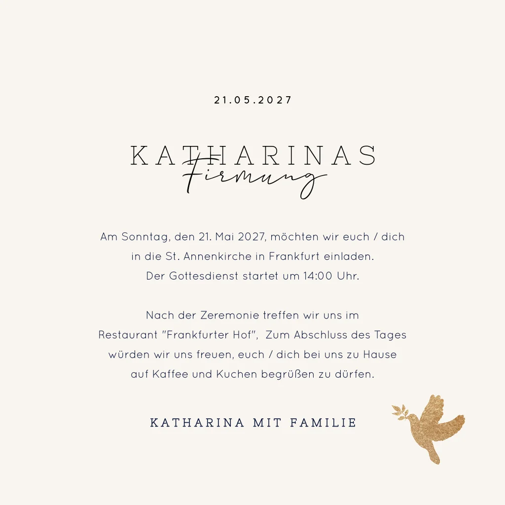 Das Design der von dir gewählten Karte wurde automatisch in andere Formate umgestellt. Wähle einfach deinen Wunschformat aus und platziere alle Texte und Elemente an der richtigen Stelle im Editor. Du hast Fragen oder dein Favorit steht nicht zur Auswahl? Dann kontaktiere uns bitte und wir werden uns gemeinsam darum kümmern!