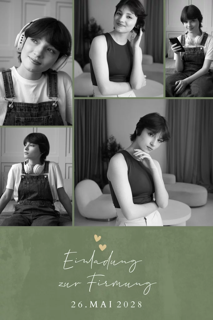 Einladung zur Firmung mit Fotocollage in Salbeigrün