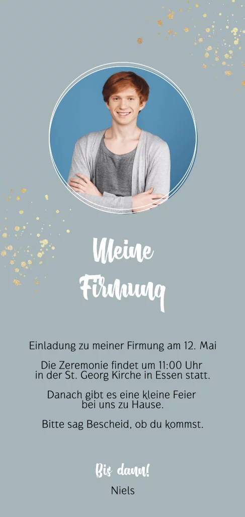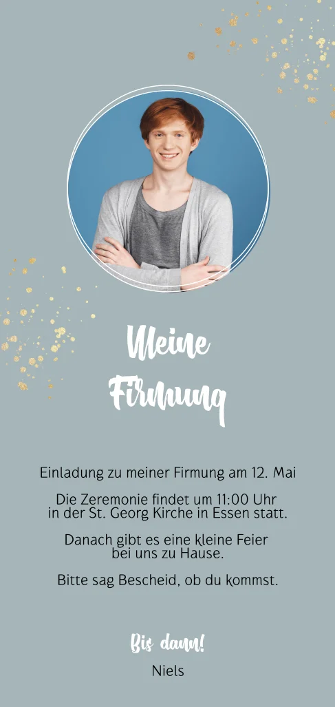 Das Design der von dir gewählten Karte wurde automatisch in andere Formate umgestellt. Wähle einfach deinen Wunschformat aus und platziere alle Texte und Elemente an der richtigen Stelle im Editor. Du hast Fragen oder dein Favorit steht nicht zur Auswahl? Dann kontaktiere uns bitte und wir werden uns gemeinsam darum kümmern!