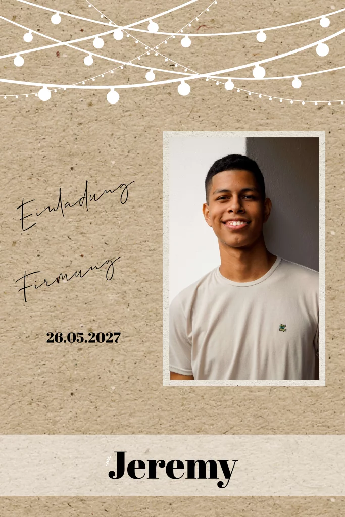 Einladung zur Firmung im Kraft-Look mit Foto auf der Vorderseite.