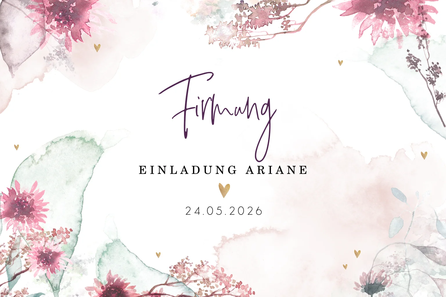Einladungskarte zur Firmung mit Aquarell Blüten und goldenen Herzen.