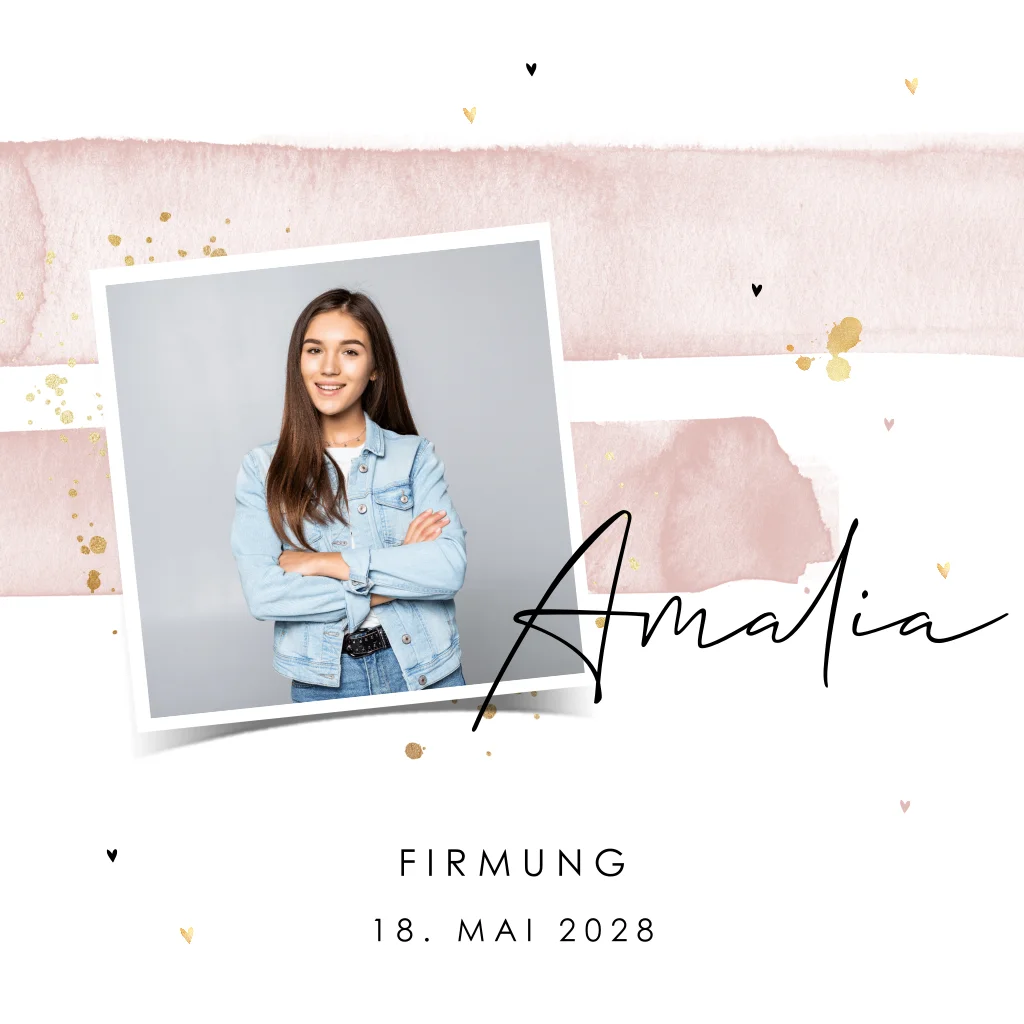 Moderne Einladung zur Firmung mit Foto und rosa Aquarell Strichen und goldenen Tupfern.