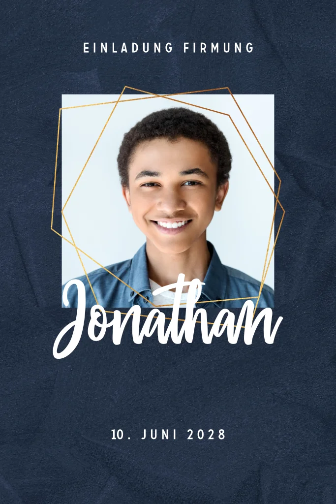 Moderne Einladungskarte zur Firmung mit nachtblauem Hintergrund und goldenem Rahmen.