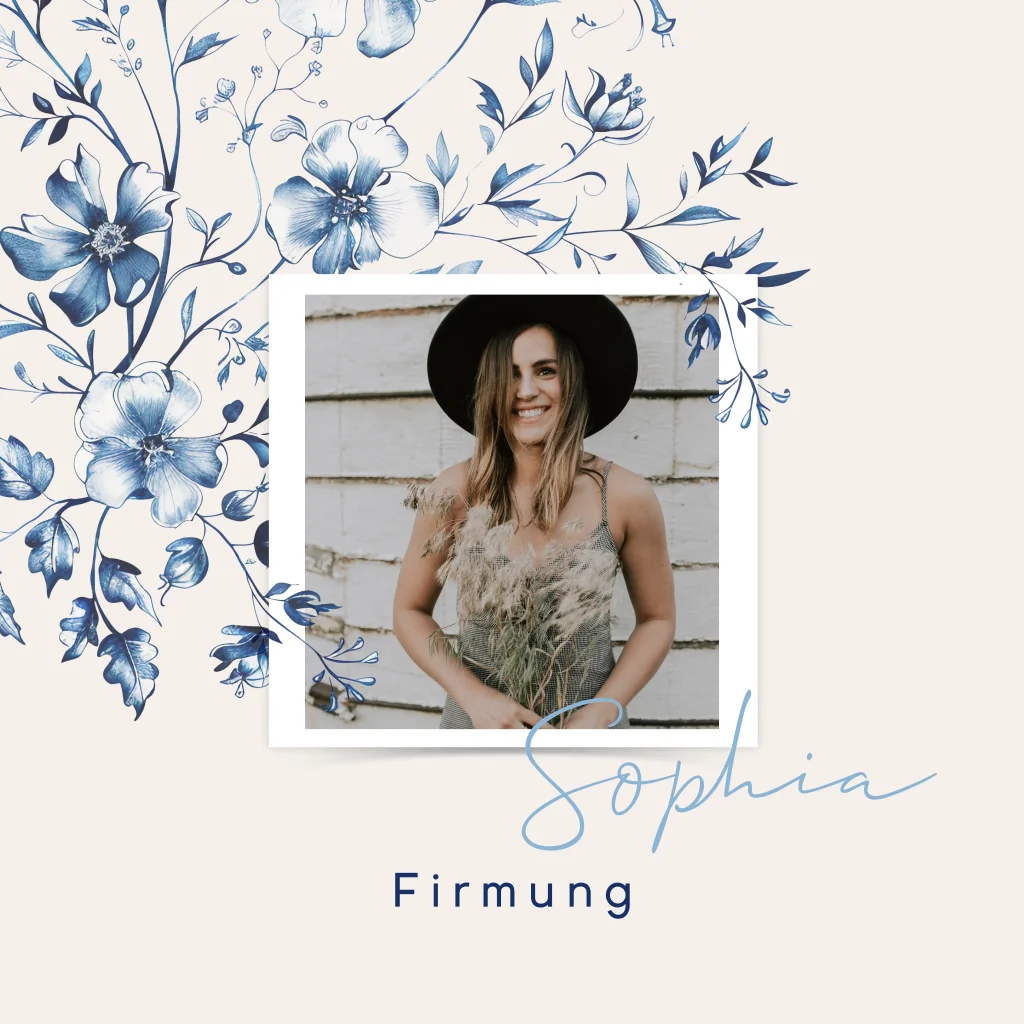 Verspielte Einladung zur Firmung mit blauen Blüten