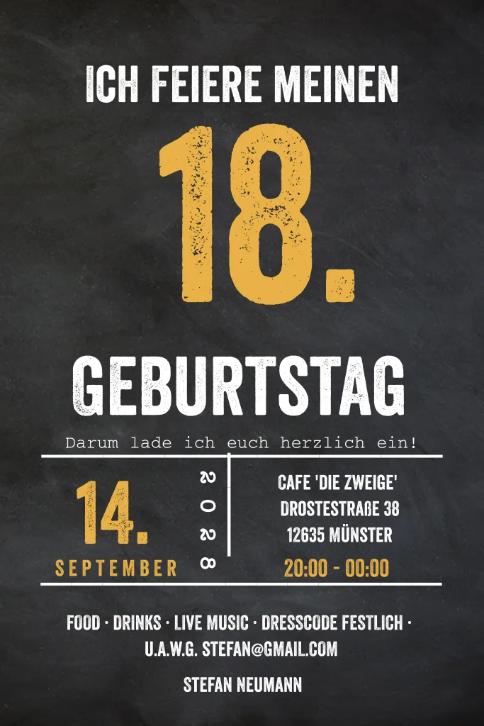 Der 18. Geburtstag ist etwas ganz Besonderes. Du und deine Volljährigkeit sollten an diesem Tage / Abend im Mittelpunkt stehen, so auch auf deiner Party. Um all deine anstehenden Gäste rechtzeitig wissen zu lassen, wo und wann die Party steigt, kannst du hier eine originelle Karte gestalten!