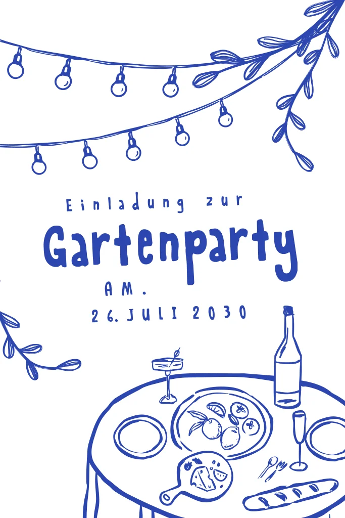 Einladung zur Gartenparty in Blau und Weiß mit Illustrationen