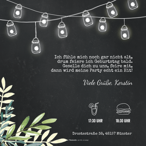 Geburtstagseinladung mit Zweigen, Lichterkette und dunklem Hintergrund