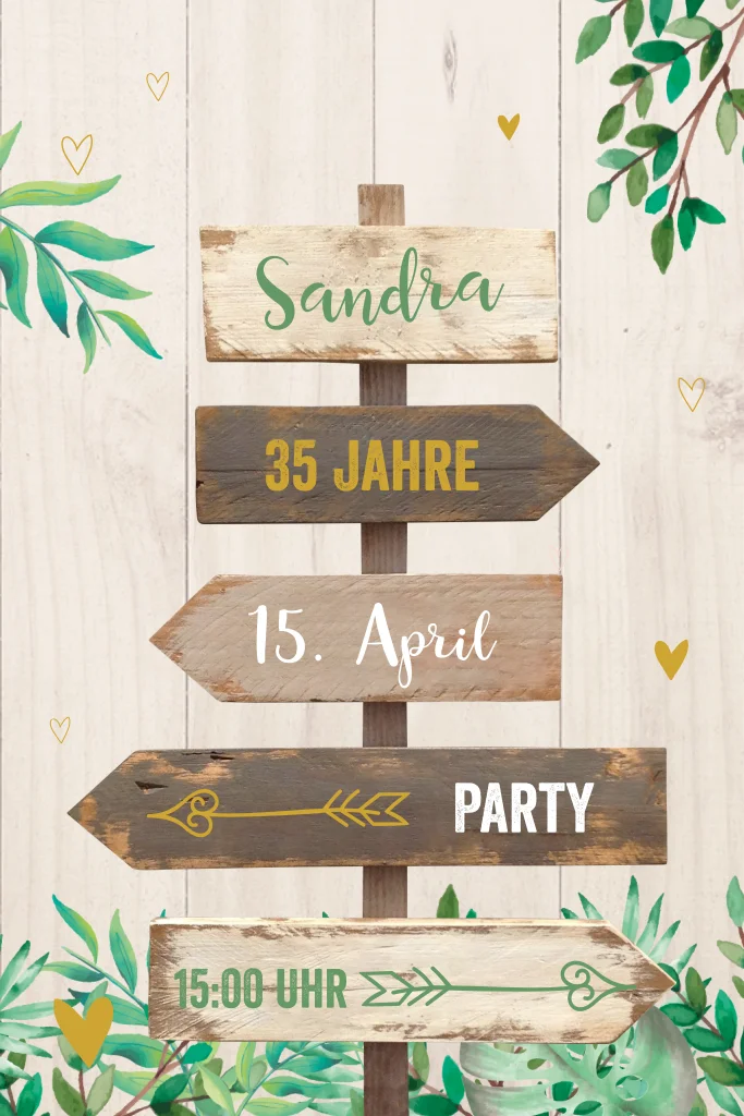 Einladungskarte mit Pflanzen, Wegweiser und goldgelben Herzen