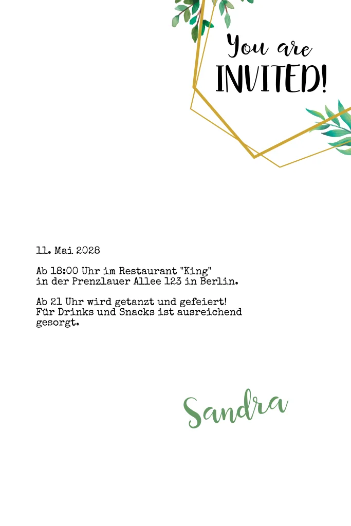 Familie, Freunde und Bekannte zum Geburtstag per Whatsapp einladen? Persönlicher, origineller und schöner sind immer noch richtige Einladungskarten. Im Online-Editor kannst du dein eigenes Foto hinzufügen, den Text ändern und die Farben und Schriftarten anpassen.