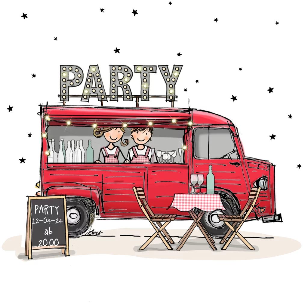 Kreative Geburtstagseinladung mit Illustration eines roten Lieferwagens, dem Wort "Party" in beleuchteten Buchstaben und einem Tisch mit Getränken. Die schwarzen Sterne auf dem weißen Hintergrund vervollständigen diese Karte.