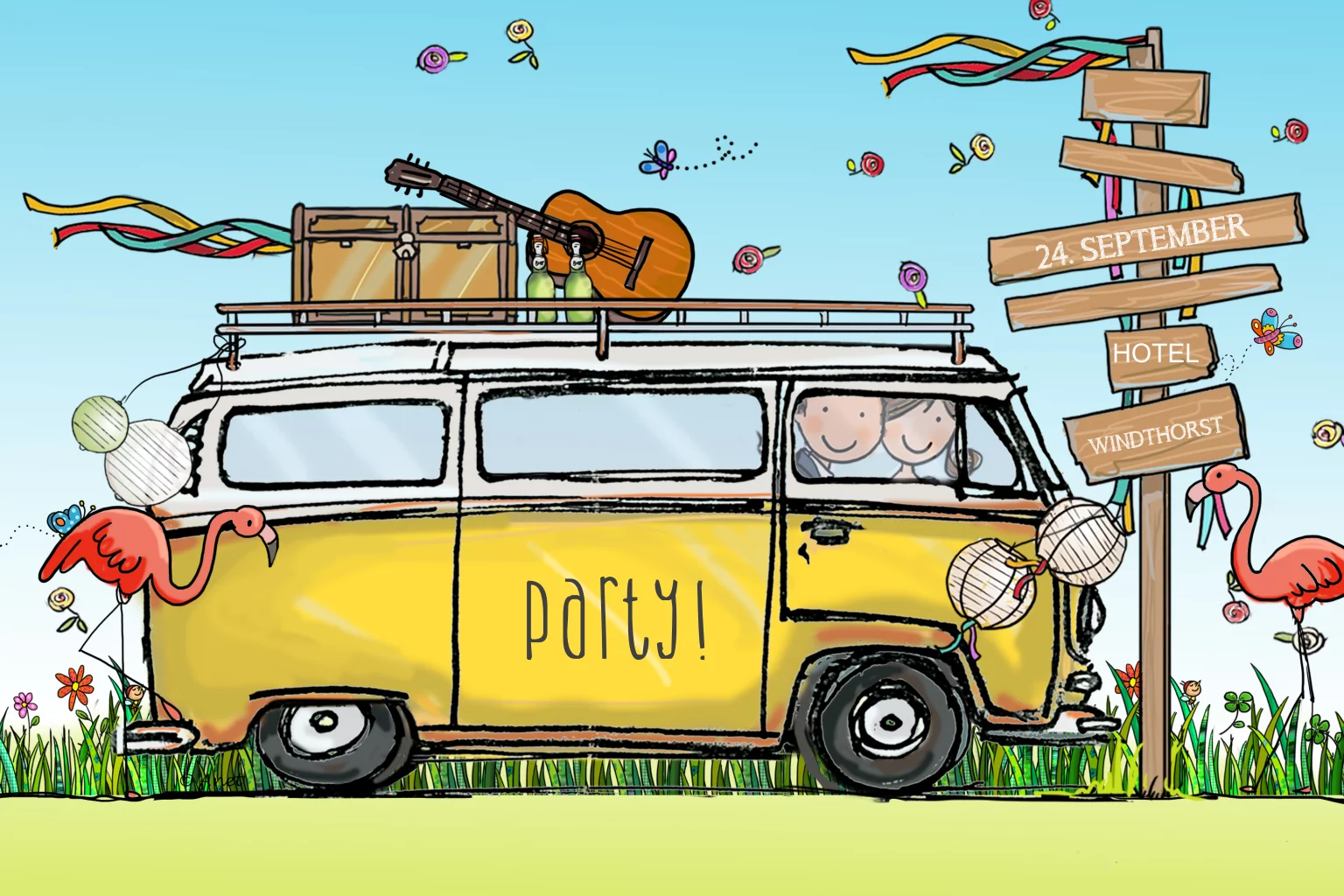 Was für eine Sommereinladung! Der gelbe Volkswagen mit Gitarre, Laternen, Flamingos und Blumen verleiht dieser Karte einen festlichen Look. Sie können den Text auf dem Wegweiser und auf der Innenseite der Karte ganz einfach selbst anpassen.