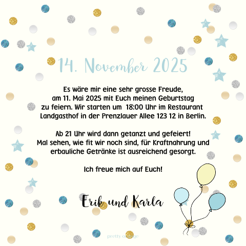 Jeder Geburtstag ist ein schöner Anlass, sich mit Familie, Freunden und Bekannten zu treffen. Um eine Geburtstagsfeier zu organisieren, sollte man über viele verschiedene Dinge nachdenken, wie Ort, Zeit, Essen und Musik. Mit einer unserer individuell designten Geburtstagseinladungen kannst du deinen Gästen stilvoll rechtzeitig Bescheid geben, wann deine Party steigt.