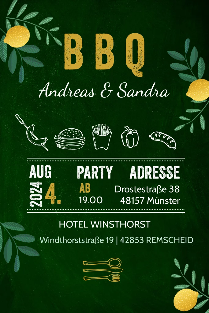 Trendige Einladung fürs Grillen mit Zitronen, Zweigen und Text auf dunkelgrünem Hintergrund.