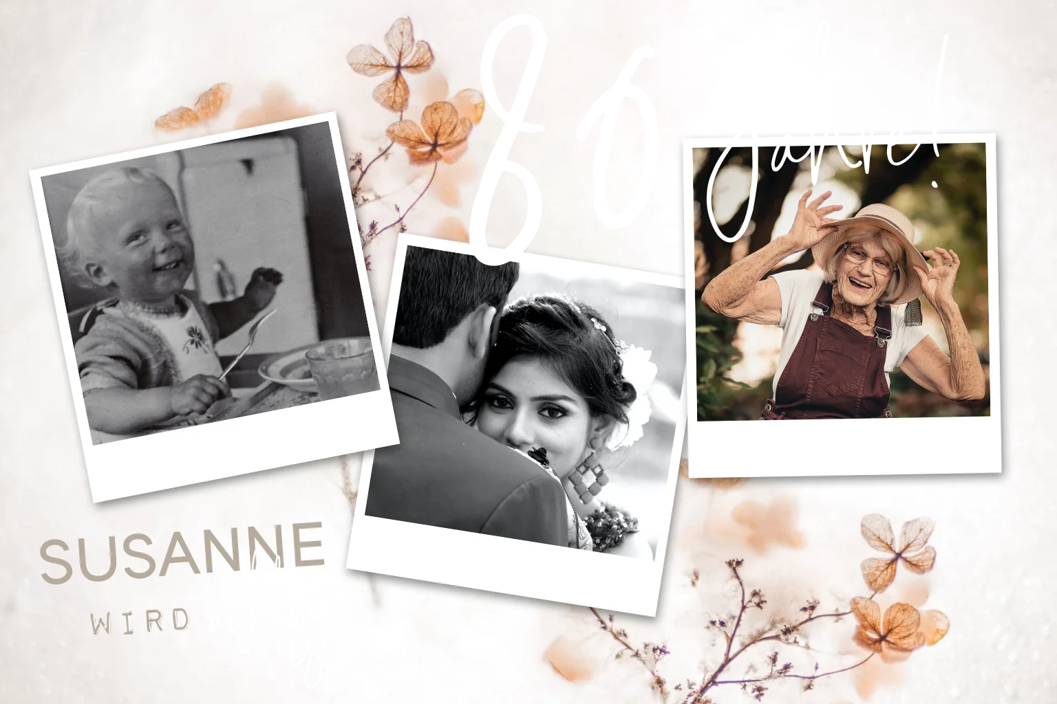 Goldfolien Einladung zum 80. mit Blumen und Fotos