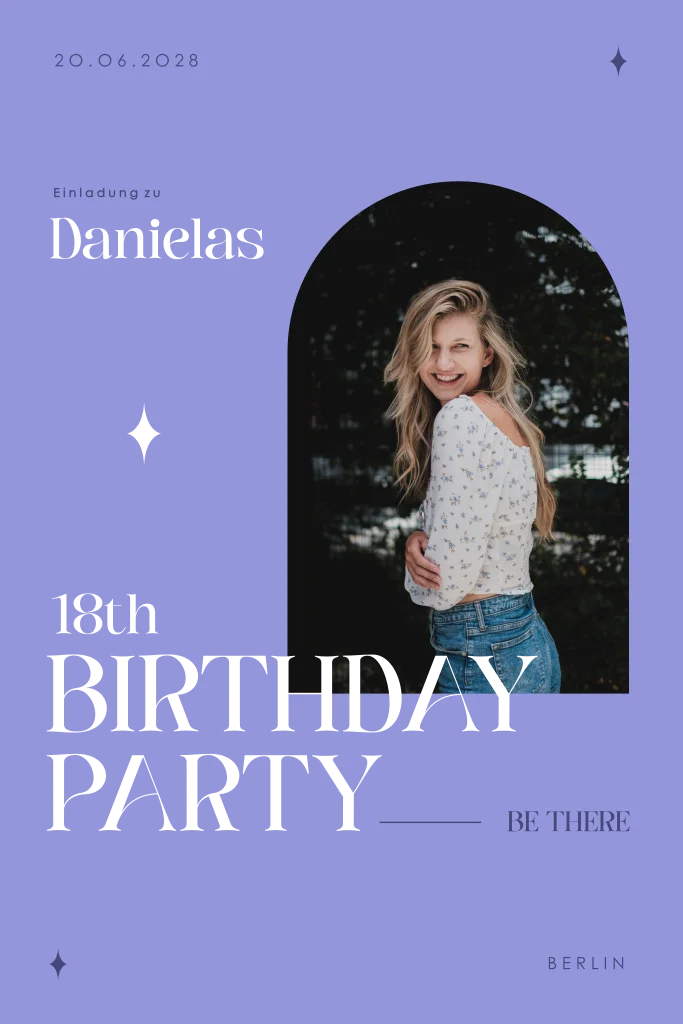 Lila Einladung mit Foto in Bogenform und schicker Goldfolie