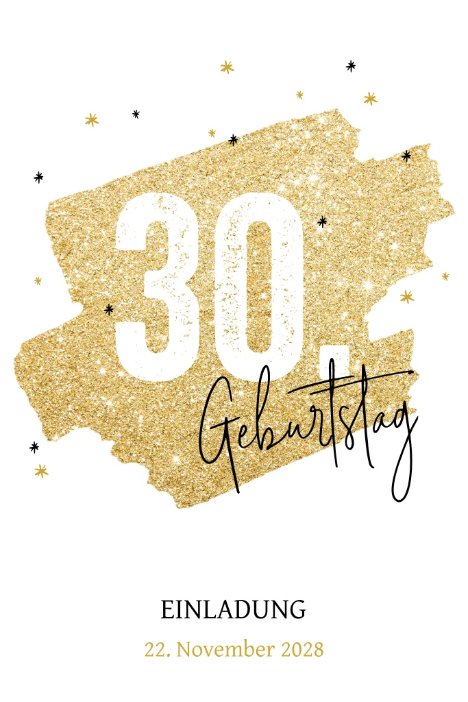 Mit dieser strahlenden Einladung wird es sicher ein fantastischer Geburtstag! Mit einem goldenen Look wird ein Farbstreifen mit Sternchen auf die Karte gezeichnet. In einer angesagten Schrift steht groß 30. Alles ist leicht selbst anzupassen.