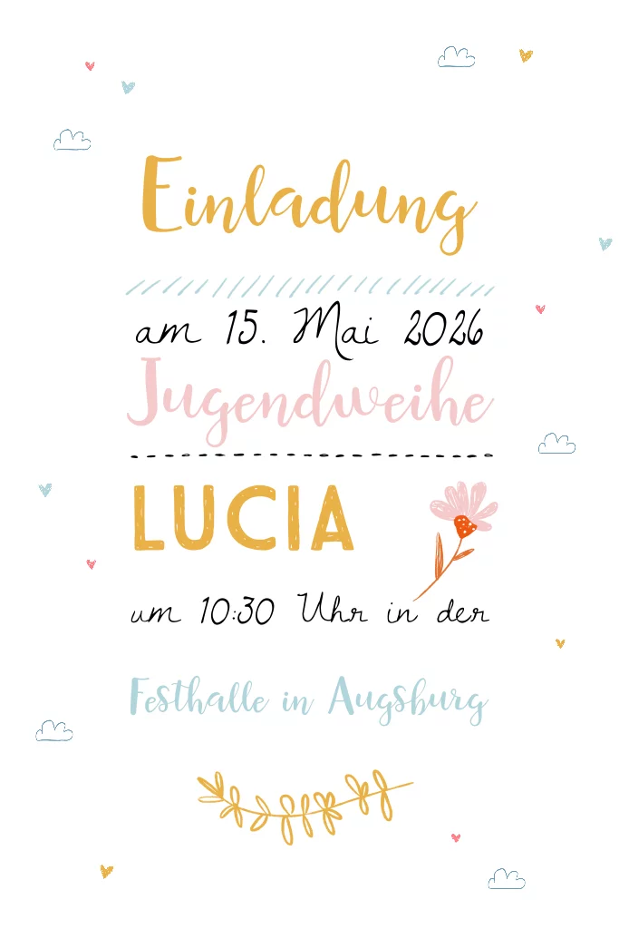 Einladung Jugendweihe mit verspielten Schriftarten und bunten Farben