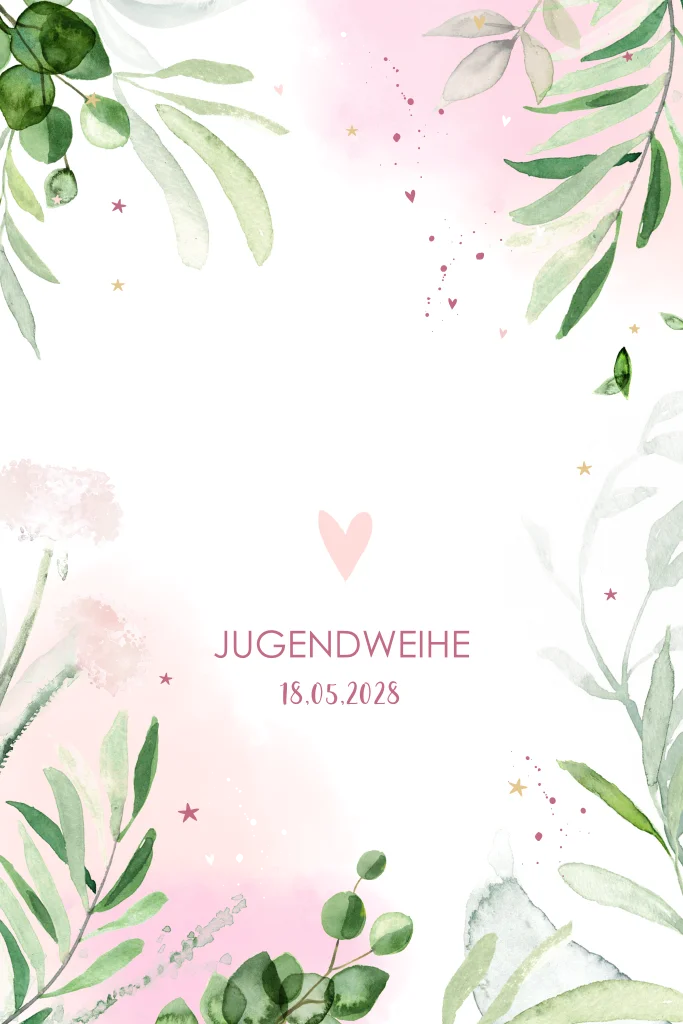 Einladung zur Jugenweihe mit Zweigen, Blättern, Goldfolie und Herzchen