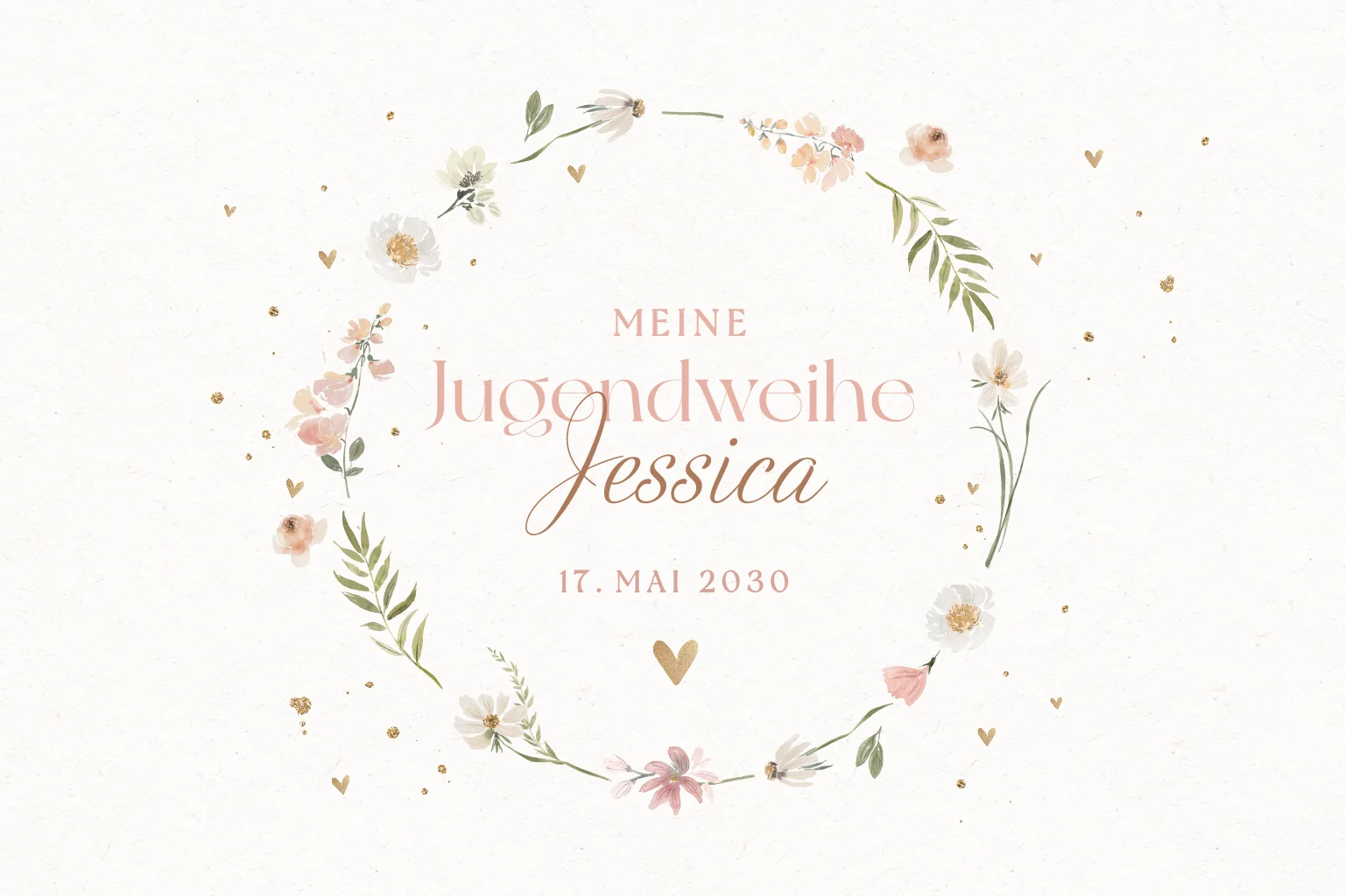 Romantische Einladung zur Jugendweihe mit Blumenkranz und Herzchen