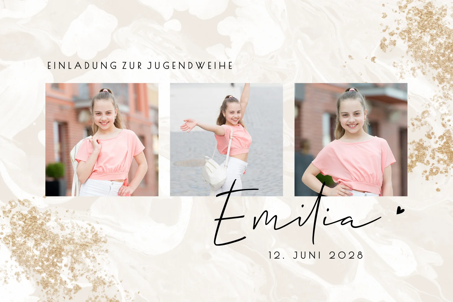 Verspielte Einladung zur Jugendweihe mit Goldflecken und Fotos