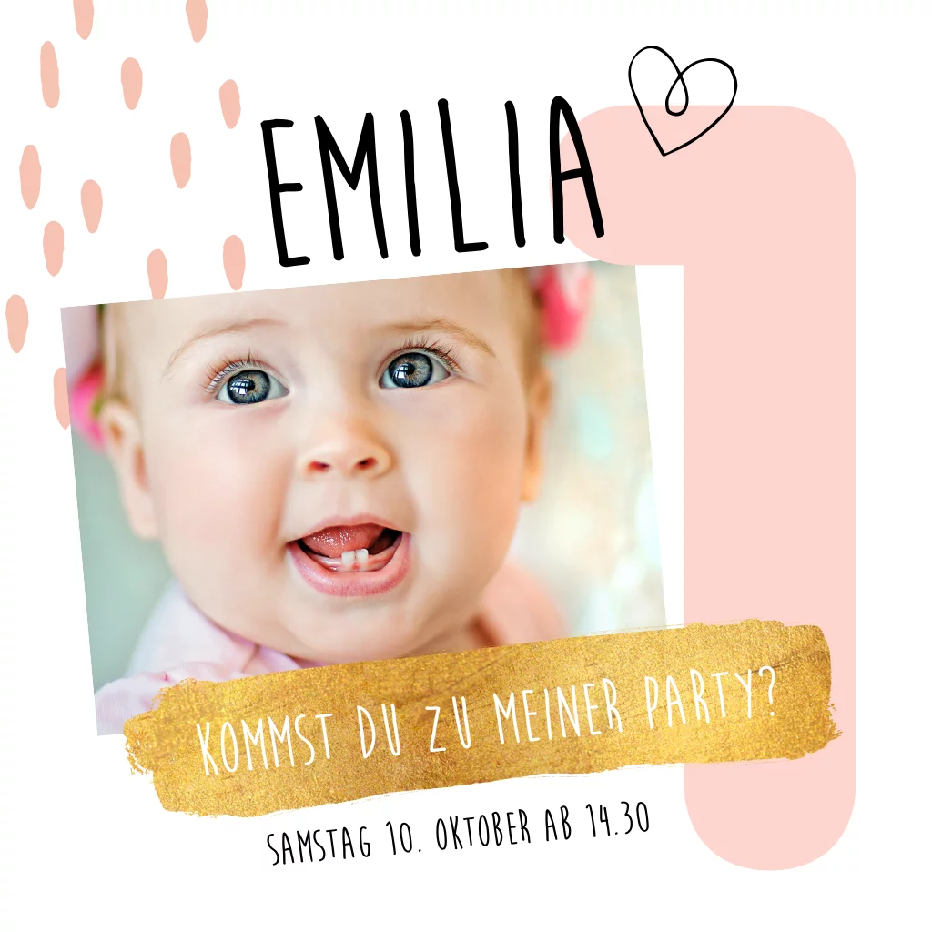 Angesagte Einladung für den ersten Geburtstag Ihrer Tochter mit goldenen und rosa Details.