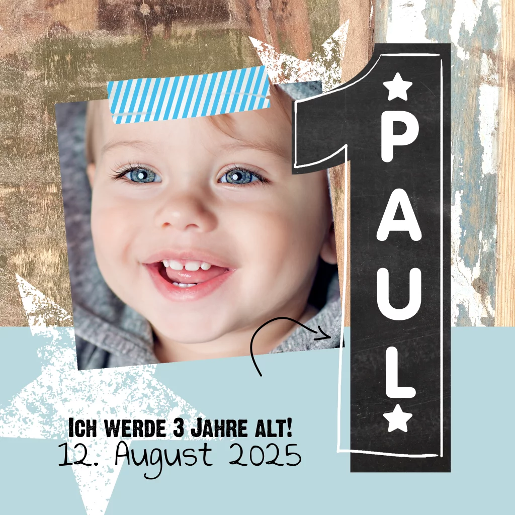 Moderne und coole Einladung mit hölzernem Hintergrund und weißen Sternen. Platzieren Sie das Foto Ihres Sohnes auf die Karte.