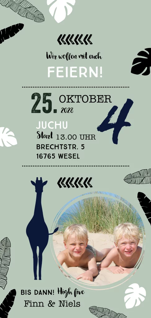 Einladung zum Kindergeburtsag mit exotischen Elementen und Giraffe