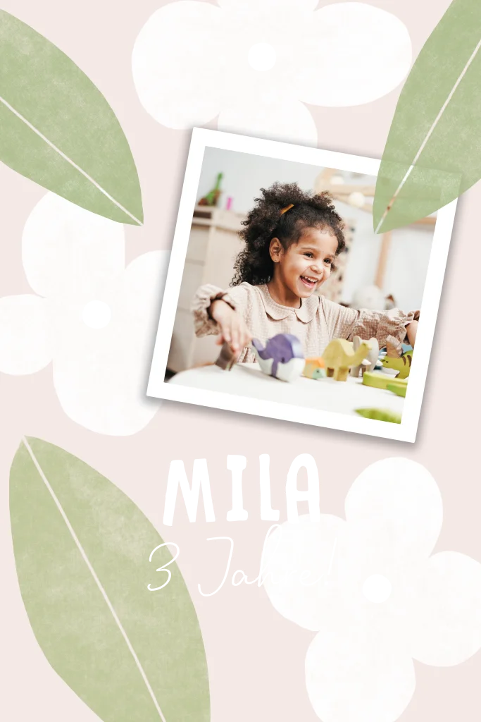 Einladung Kinderparty mit Foto, rosa Blumen und Goldfolie