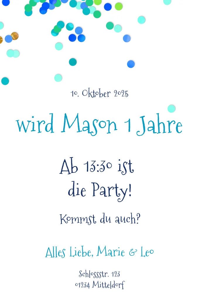 Niedliche Einladung für den Geburtstag eines Jungen mit einem Foto und festlichen Konfettis.Das Design der von dir gewählten Karte wurde automatisch in andere Formate umgestellt. Wähle einfach deinen Wunschformat aus und platziere alle Texte und Elemente an der richtigen Stelle im Editor. Du hast Fragen oder dein Favorit steht nicht zur Auswahl? Dann kontaktiere uns bitte und wir werden uns gemeinsam darum kümmern!