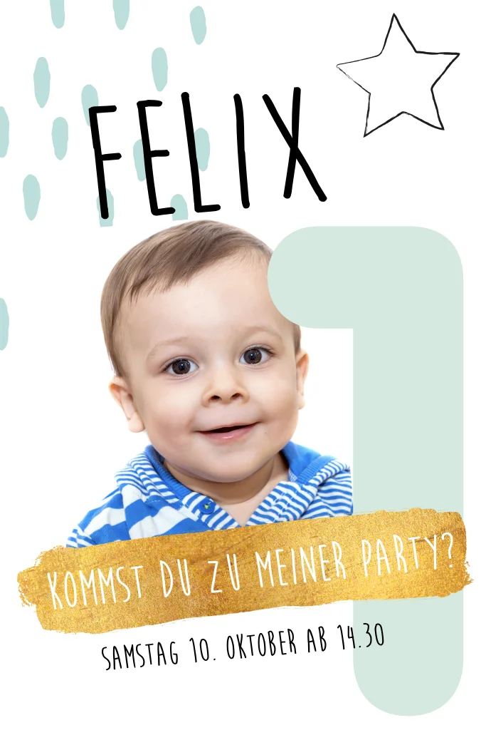 Angesagte Einladung zum Geburtstag eines Jungen in Mint und Gold. Laden Sie Ihr eigenes Foto auf die Karte.