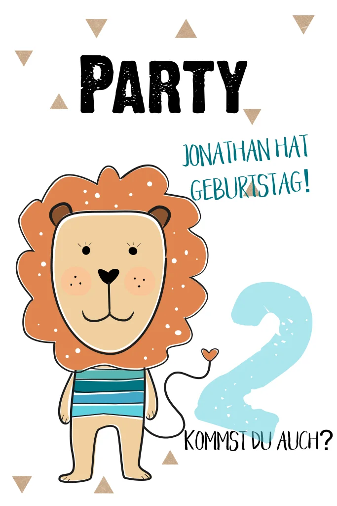 Witzige Einladung für eine Kinderparty. Schön illustriert mit einem Löwen und Konfetti-Dreiecken. Mit dieser Karte fängt der zweite Geburtstag Ihres Kindes gut an. Schön mit hellblauem oder Kraft-Look Umschlag.