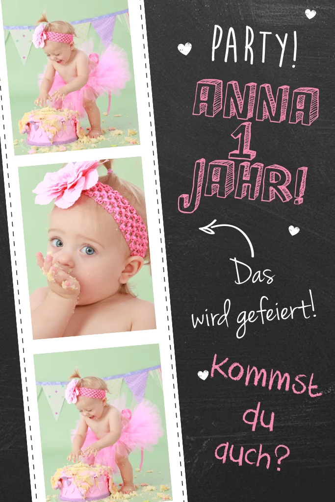 Coole Einladung für ein Mädchen mit Fotostreifen auf Tafel.Das Design der von dir gewählten Karte wurde automatisch in andere Formate umgestellt. Wähle einfach deinen Wunschformat aus und platziere alle Texte und Elemente an der richtigen Stelle im Editor. Du hast Fragen oder dein Favorit steht nicht zur Auswahl? Dann kontaktiere uns bitte und wir werden uns gemeinsam darum kümmern!
