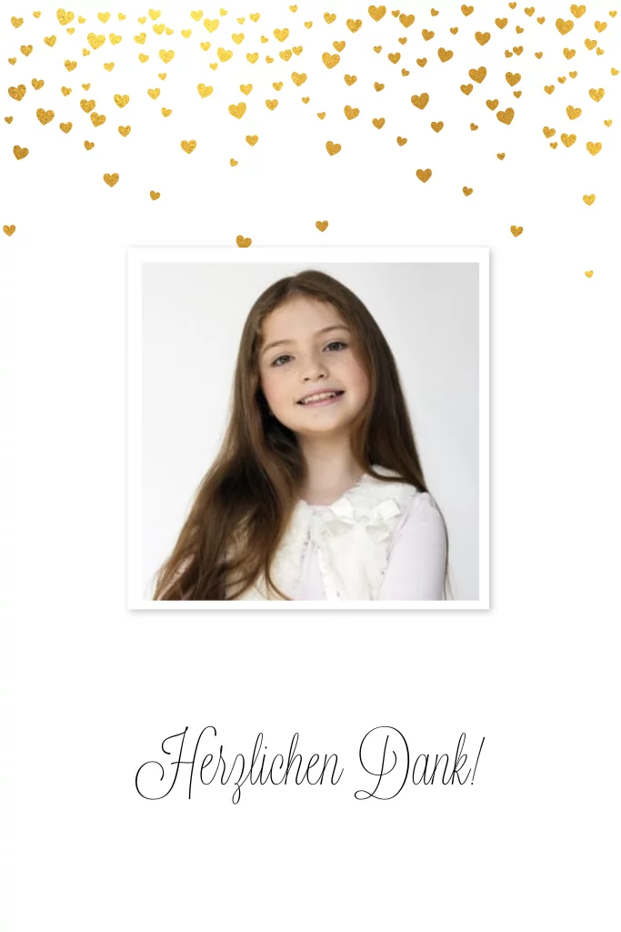 Eine hübsche Dankeskarte mit eigenen Foto und goldfarbenen Herzen. Eine schöne Karte als Dankeschön für Ihre Gäste, einfach mit Ihrem eigenen Foto.Das Design der von dir gewählten Karte wurde automatisch in andere Formate umgestellt. Wähle einfach deinen Wunschformat aus und platziere alle Texte und Elemente an der richtigen Stelle im Editor. Du hast Fragen oder dein Favorit steht nicht zur Auswahl? Dann kontaktiere uns bitte und wir werden uns gemeinsam darum kümmern!