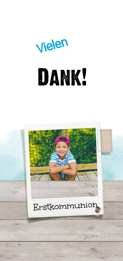 Trendige Karte, um der Familie und anderen zu danken, dass sie bei der Kommunion Ihres Sohns waren. Mit modischem blauem Aquarell und Holz als Hintergrund. Platzieren Sie ein schönes Foto Ihres Sohnes in das Polaroid und machen Sie die Dankeskarte persönlich.Melde dich für unseren Newsletter an und profitiere von exklusiven Angeboten, kreativen Ideen und Neuigkeiten aus unserer Produktwelt. Als Dankeschön für deine Anmeldung schenken wir dir einen kostenlosen Probedruck deiner Karte.