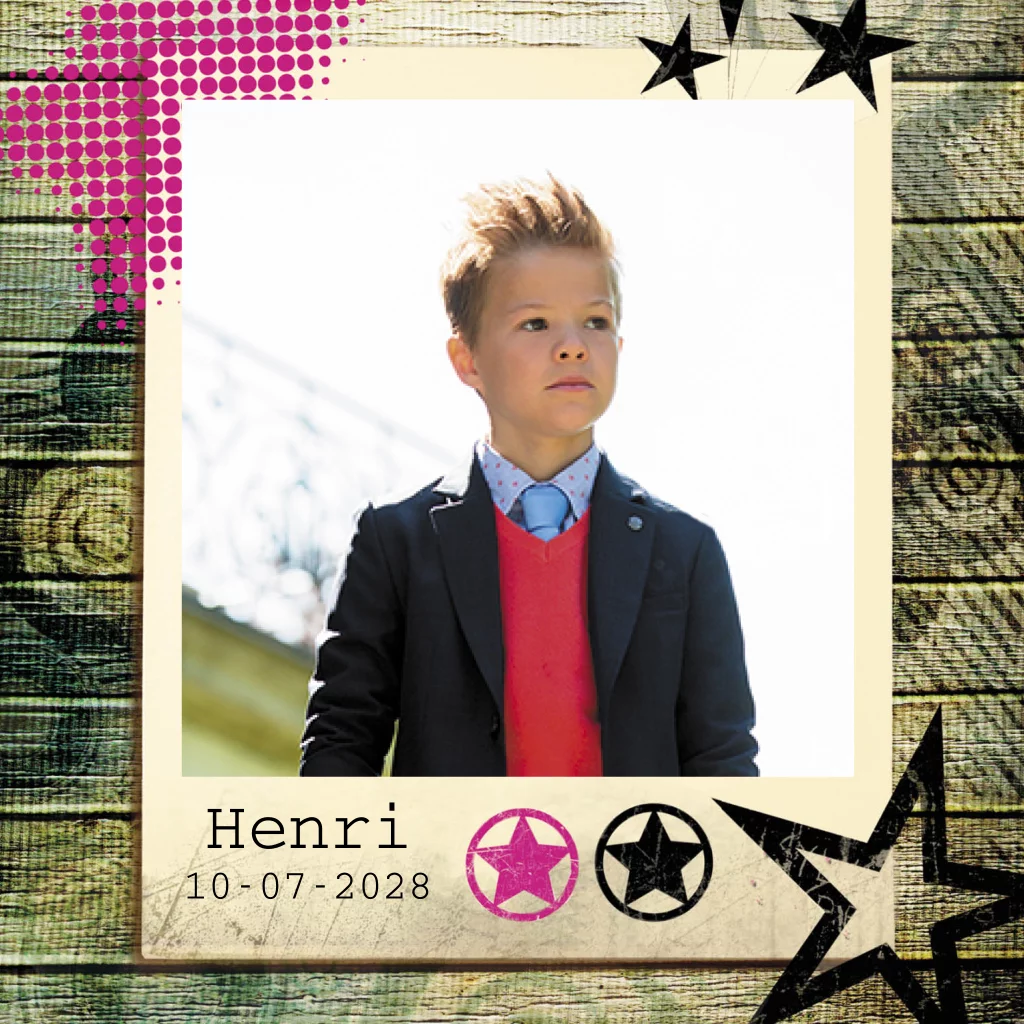Originelle Danksagung, mit der Sie allen für ihre Anwesenheit bei der Erstkommunion Ihres Kindes bedanken können. Mit coolen Elementen wie der hölzerne Hintergrund und Sterne. Texte und Farben können im Online-Editor angepasst werden. Dort kann auch ein eigenes Foto hochgeladen werden.