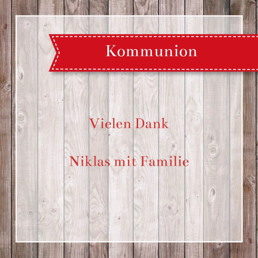 Originelle Danksagung zur Erstkommunion. Der hölzerne Hintergrund ist echt cool und angesagt. Platzieren Sie ein Foto der Erstkommunion auf die Karte und schreiben Sie Ihren eigenen Text. Die Farbe des roten Labels kann nach Geschmack verändert werden.