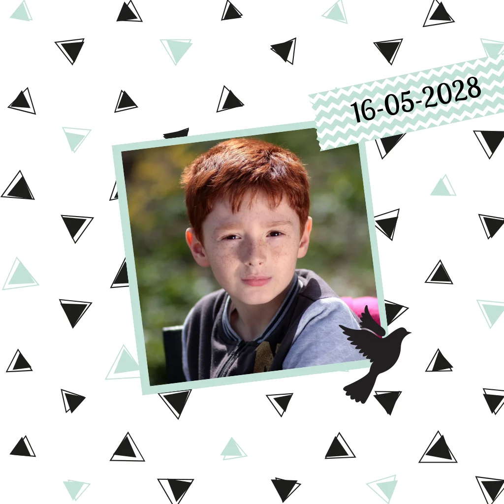 Eine trendige Danksagungskarte um nach der Erstkommunion zu verschicken. Familie und Freunde werden sich über diese moderne Karte mit schwarzen und mintgrünen Dreieckchen sicher freuen! Im Editor können Sie die Texte und Farben anpassen und das Foto ändern.