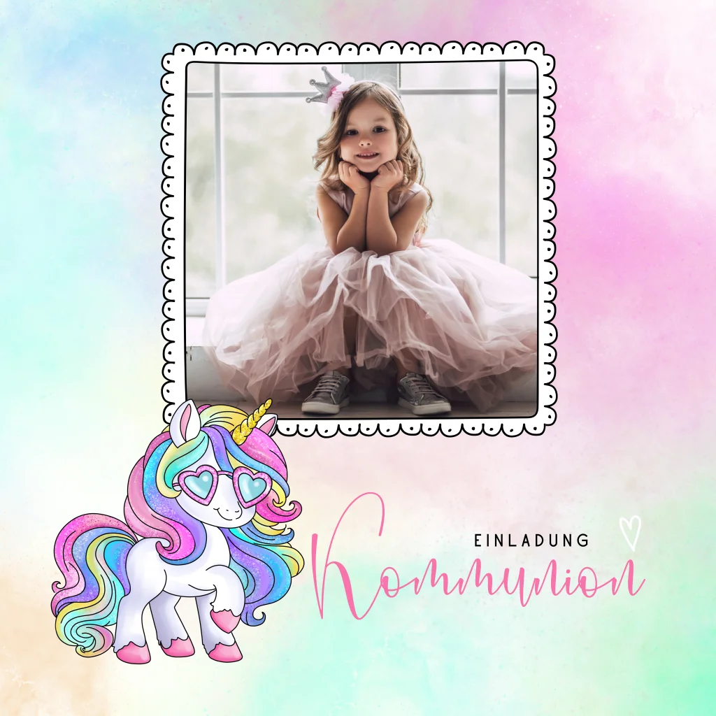 Bunte Einladung zur Kommunion mit Cartoon-Pferd und gezeichneten Rahmen