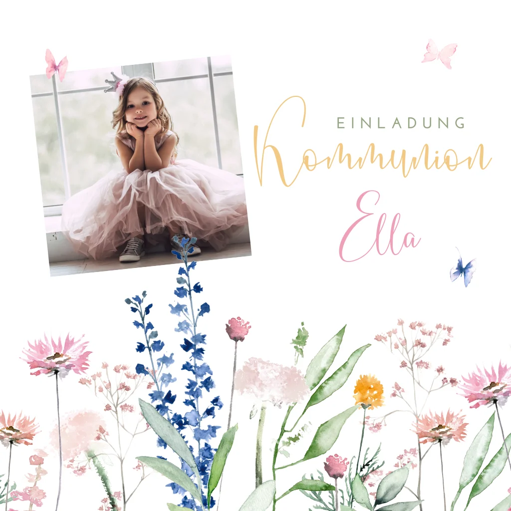 Einladung zur Kommunion mit Foto, Blumenwiese und Schmetterlingen